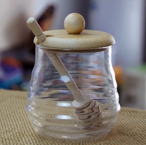 Honningkrukke i glass med trelokk og honningsskje. Perfekt for kjøkkenoppbevaring av flytende honning.